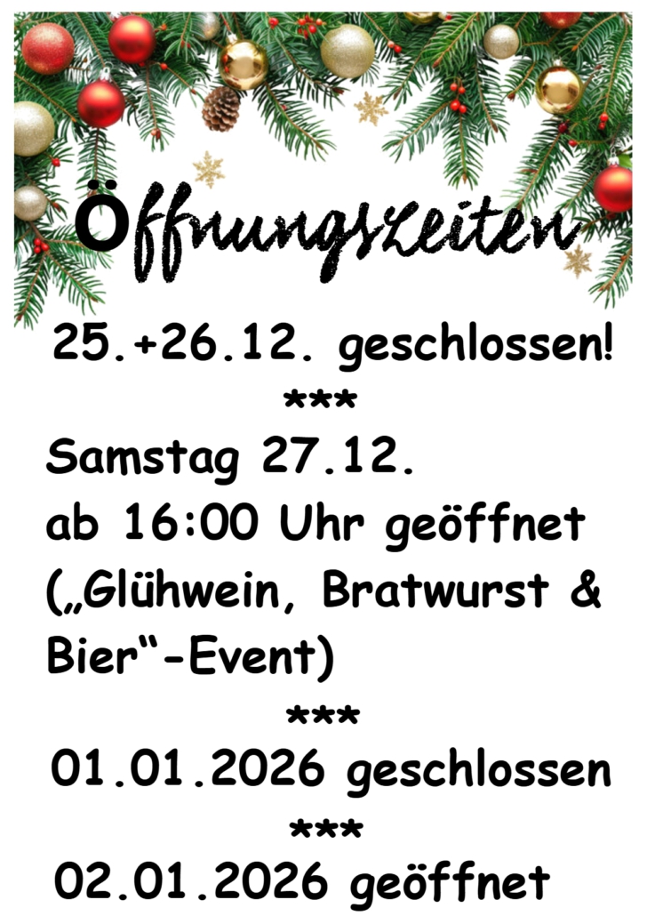 Am Donnerstag, den 25.12. sowie Freitag, den 26.12.2025 findet kein Verkauf statt!